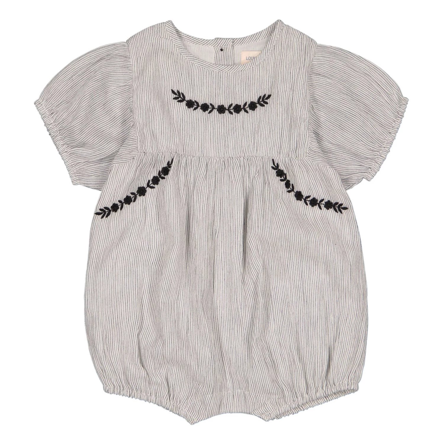 - Elastic at thighs, Crew neck, Puff sleeves, Short sleeves, Front patch pocket(s), Pleated, Embroidery