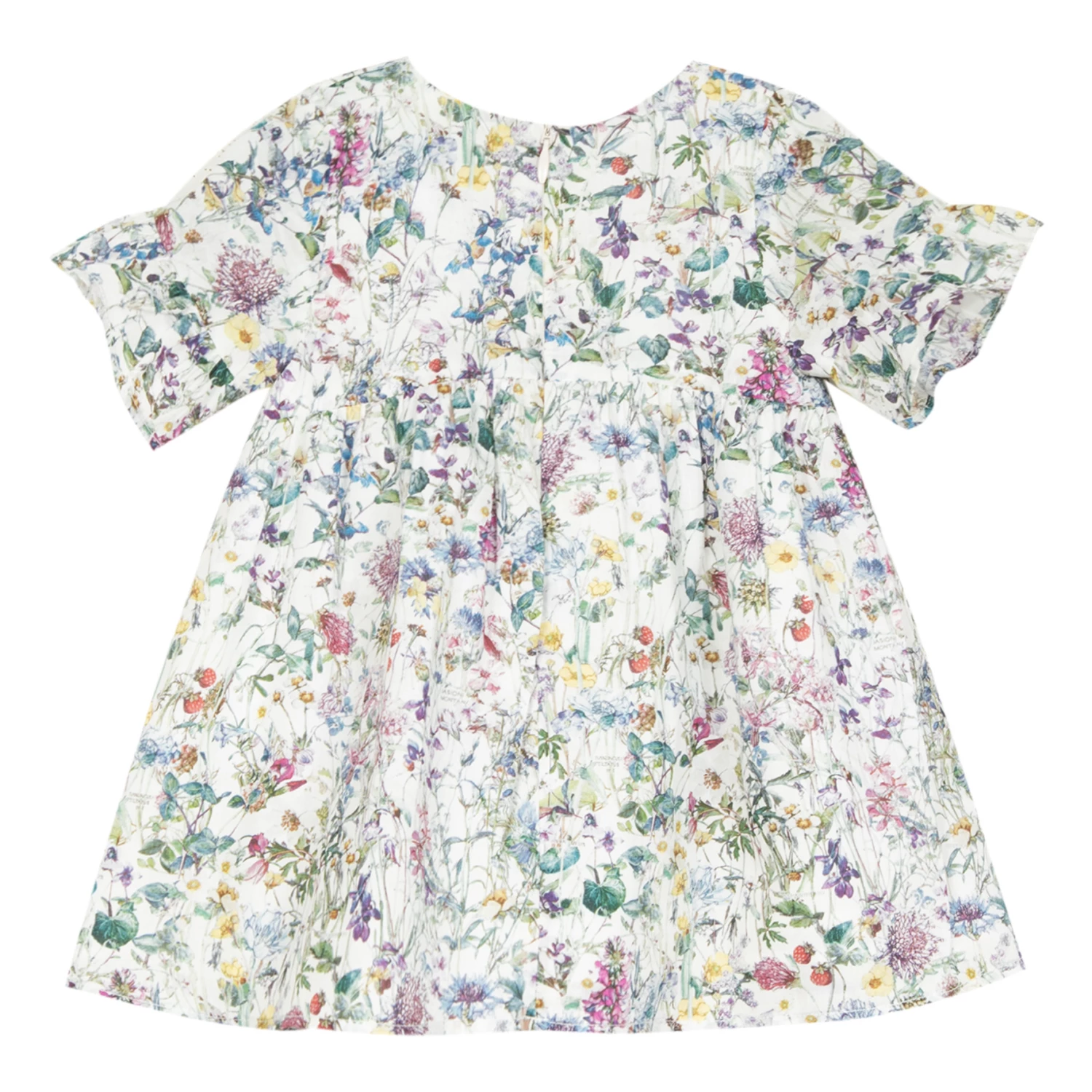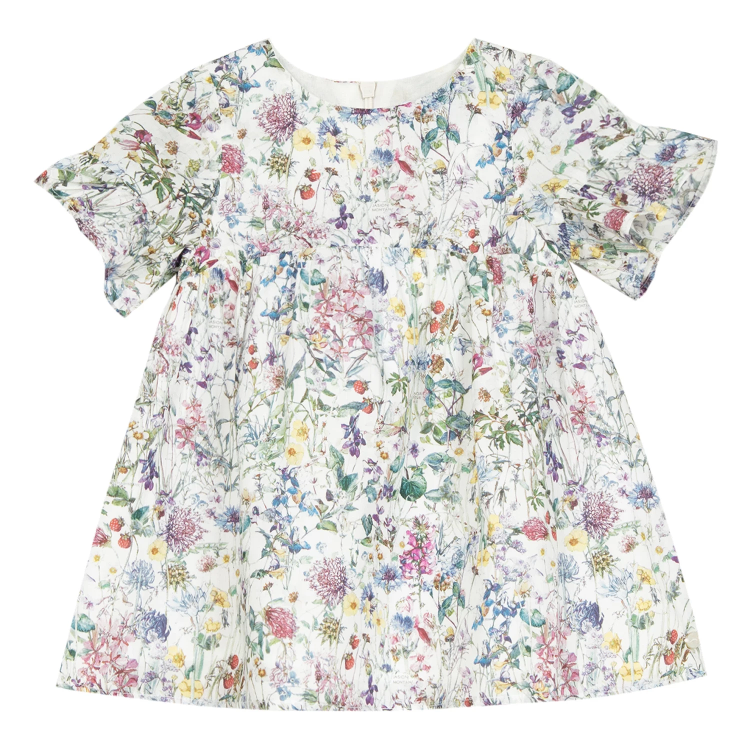 - Frilled yoke, Crew neck, Short sleeves, Knife pleat(s), Contrasting top stitch