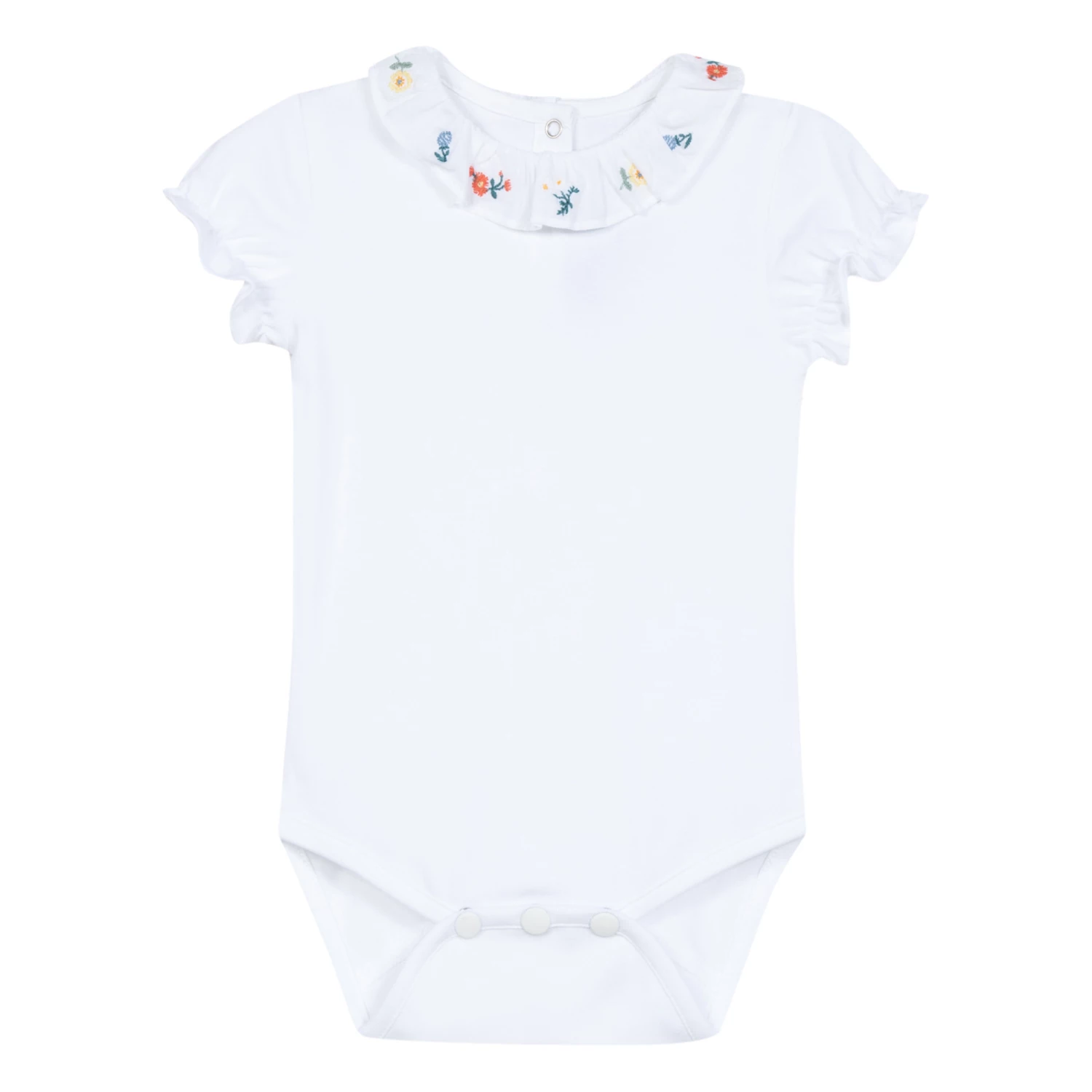 - Soft touch, Gathered armholes, Lightweight and comfortable, Short sleeves, Embroidered collar, Ruff collar