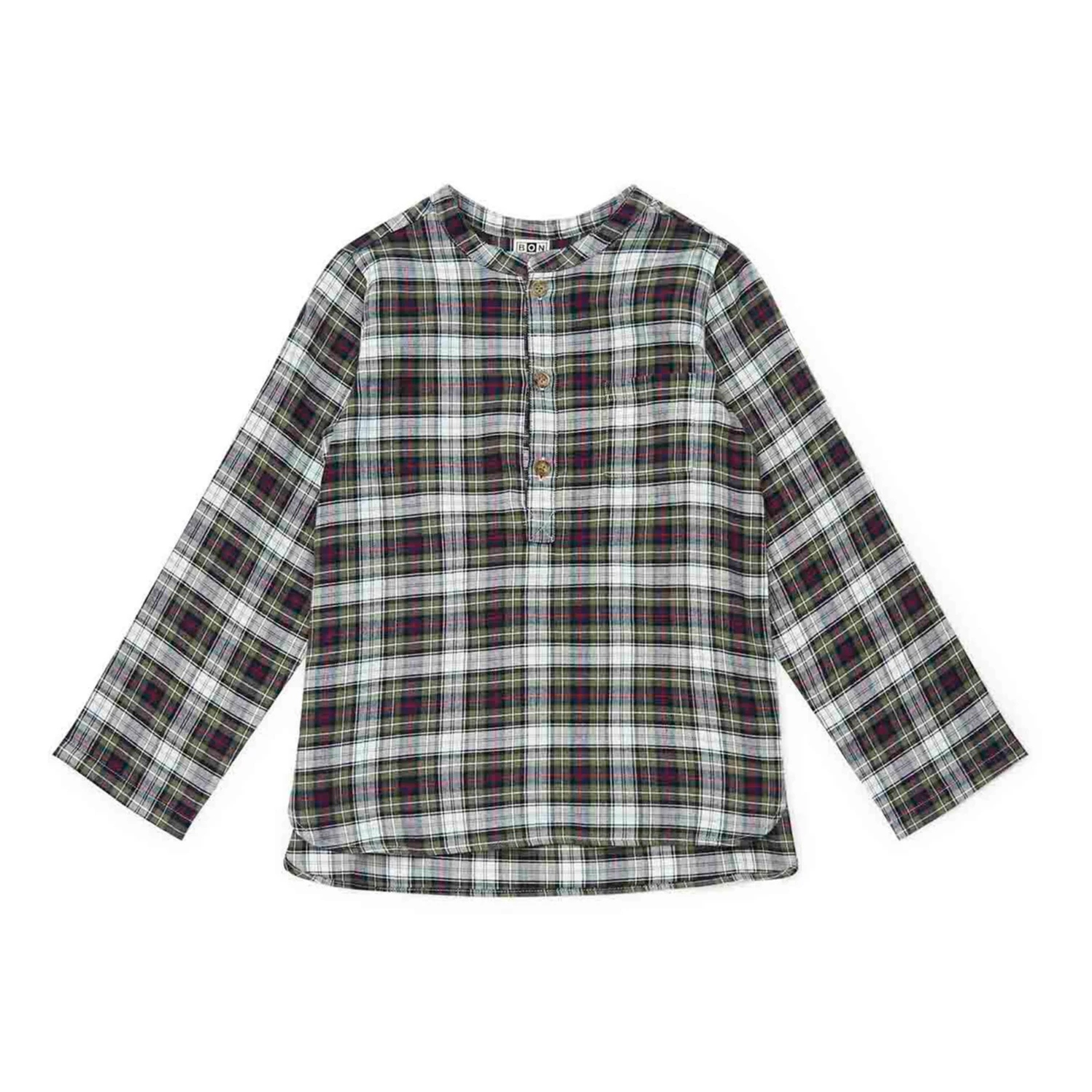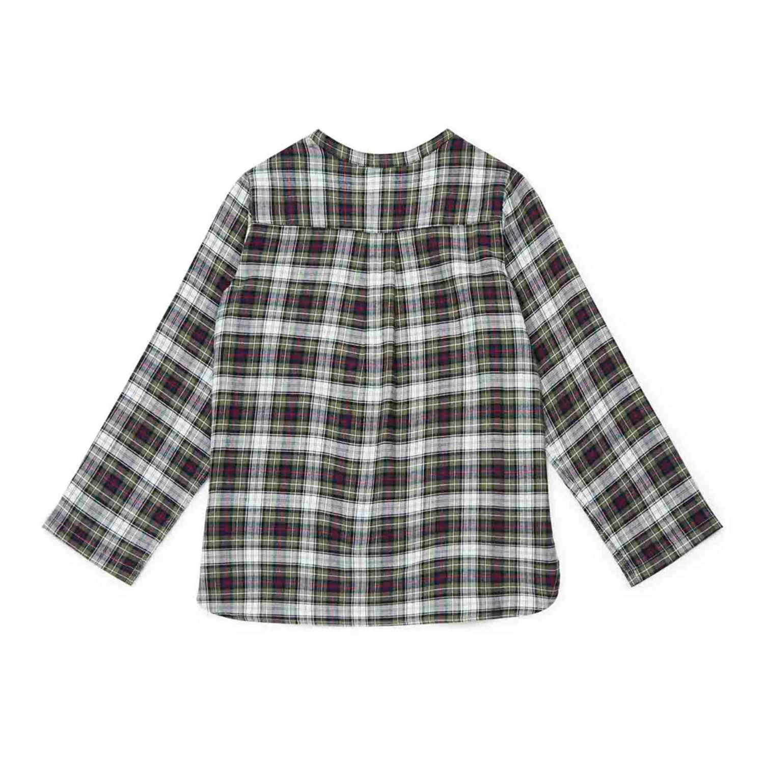- Garment pulls on, Front button(s), Checked print