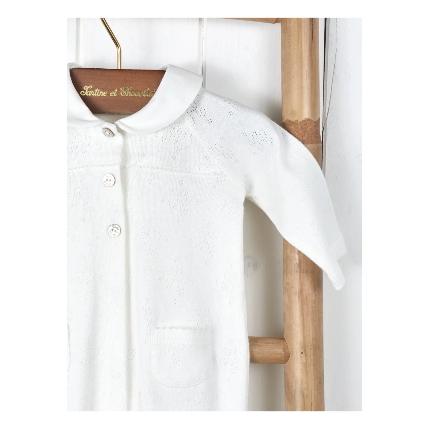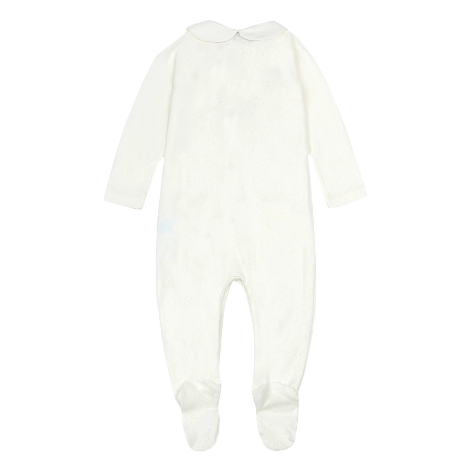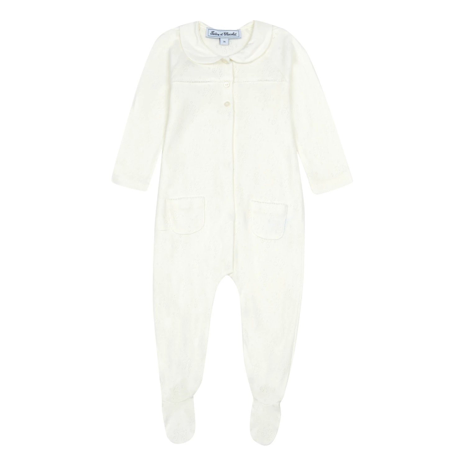 - Contrast stitching, Long sleeves, Raglan sleeve, Front patch pocket(s), Openwork knit, Integrated feet, Buttoned collar, Peter Pan collar
