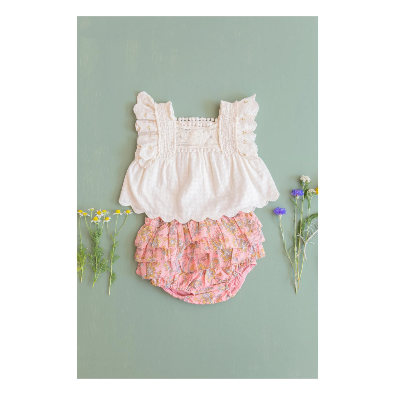 - Elastic at thighs, Frilled yoke, Decorative edges, Elasticated waist, Gathered at the waist