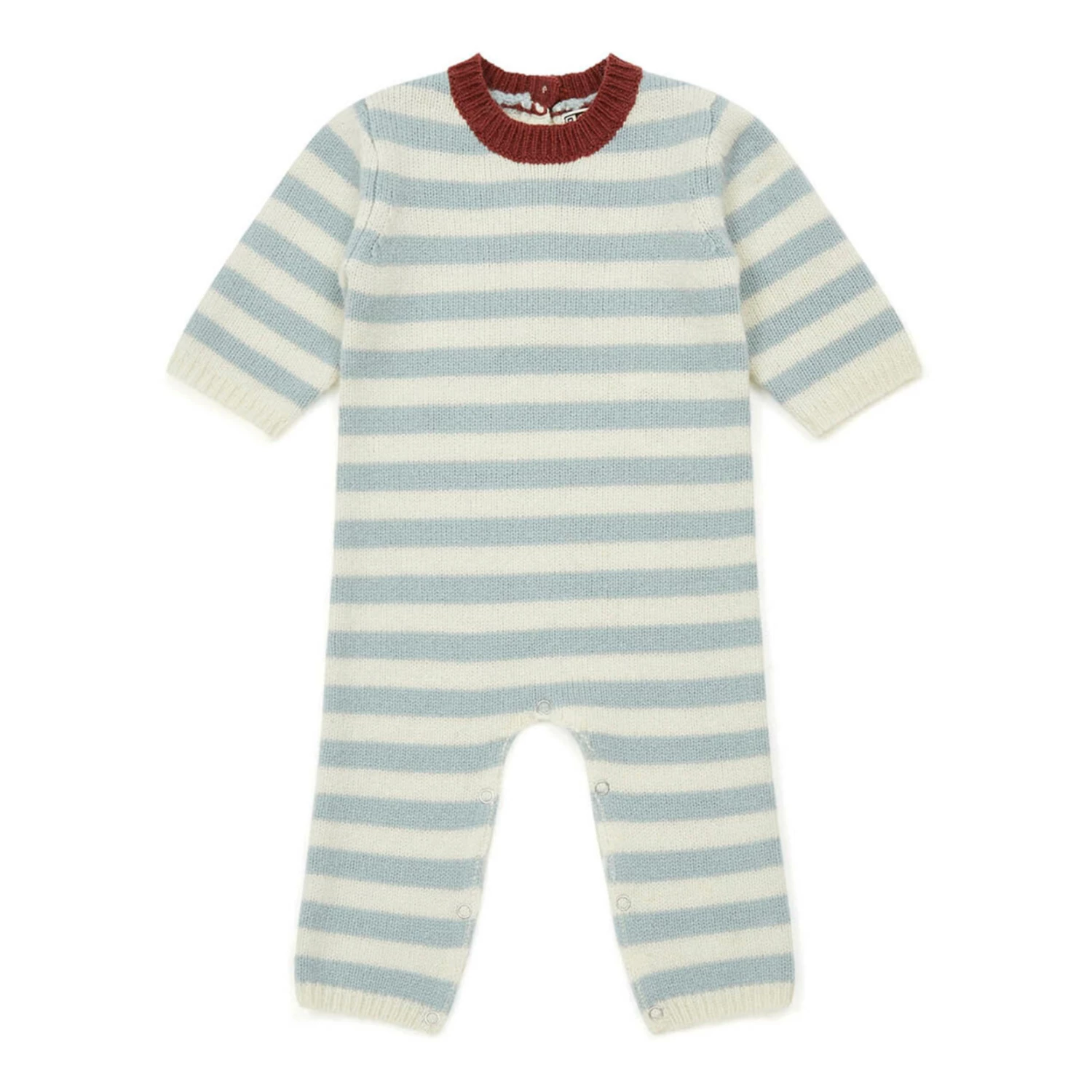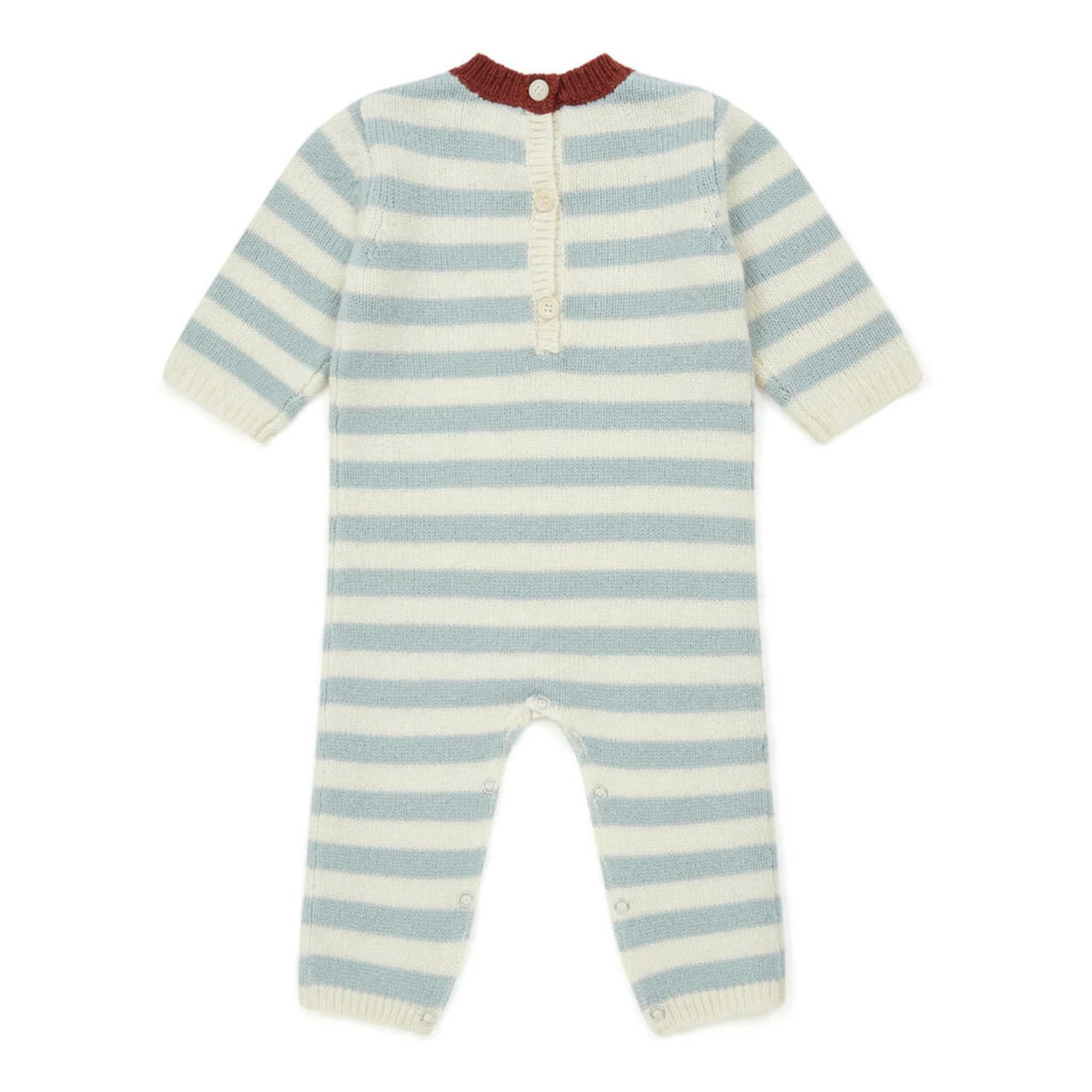 - Garment pulls on, Button(s) on the back, Press stud(s) at the crotch for easy opening, Stripe print