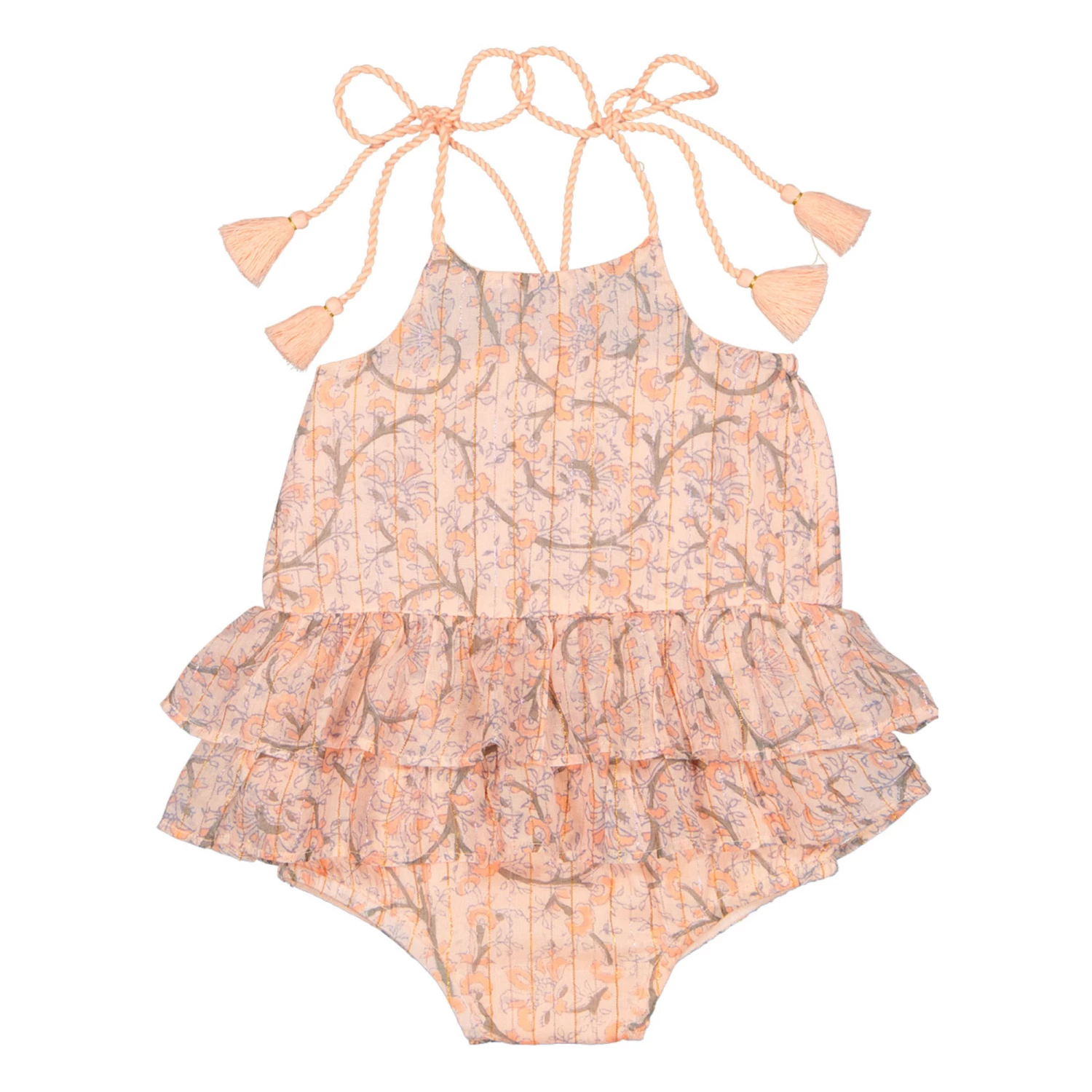 - Frilled yoke, Square neck, Pompom(s), Contrasting top stitch, Tie up straps, Adjustable